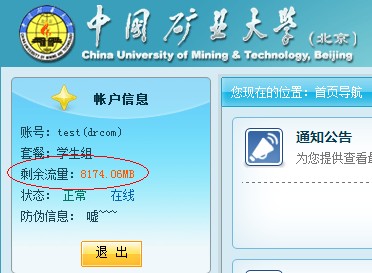 3. 用户自助服务主页帐户信息中”剩余流量“为本月剩余可用流量,此数值是截止您上一次注销后的剩余流量(试运行期间默认为 0 MB)。